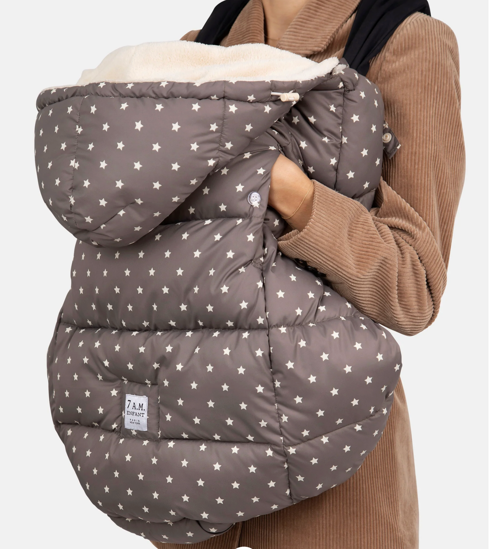 K for Kangaroo & Koala – this unique 3 in 1 solution is the ideal winter cover for ergonomic baby carriers, where baby sits like a marsupial with legs wrapped around your body. To accommodate different gear and lifestyles, the K-Poncho universally adapts to all strollers and car seats too! The K-Poncho features ultra soft plush lining, a water repellent outer shell, and premium poly insulation to keep baby warm and comfy all winter long. It's basically an extension of your winter jacket! That's how warm it is. Additional features include an adjustable hood to face frontward or outward, hand slits for easy access to baby, and bottom snaps to extend length as baby grows.
