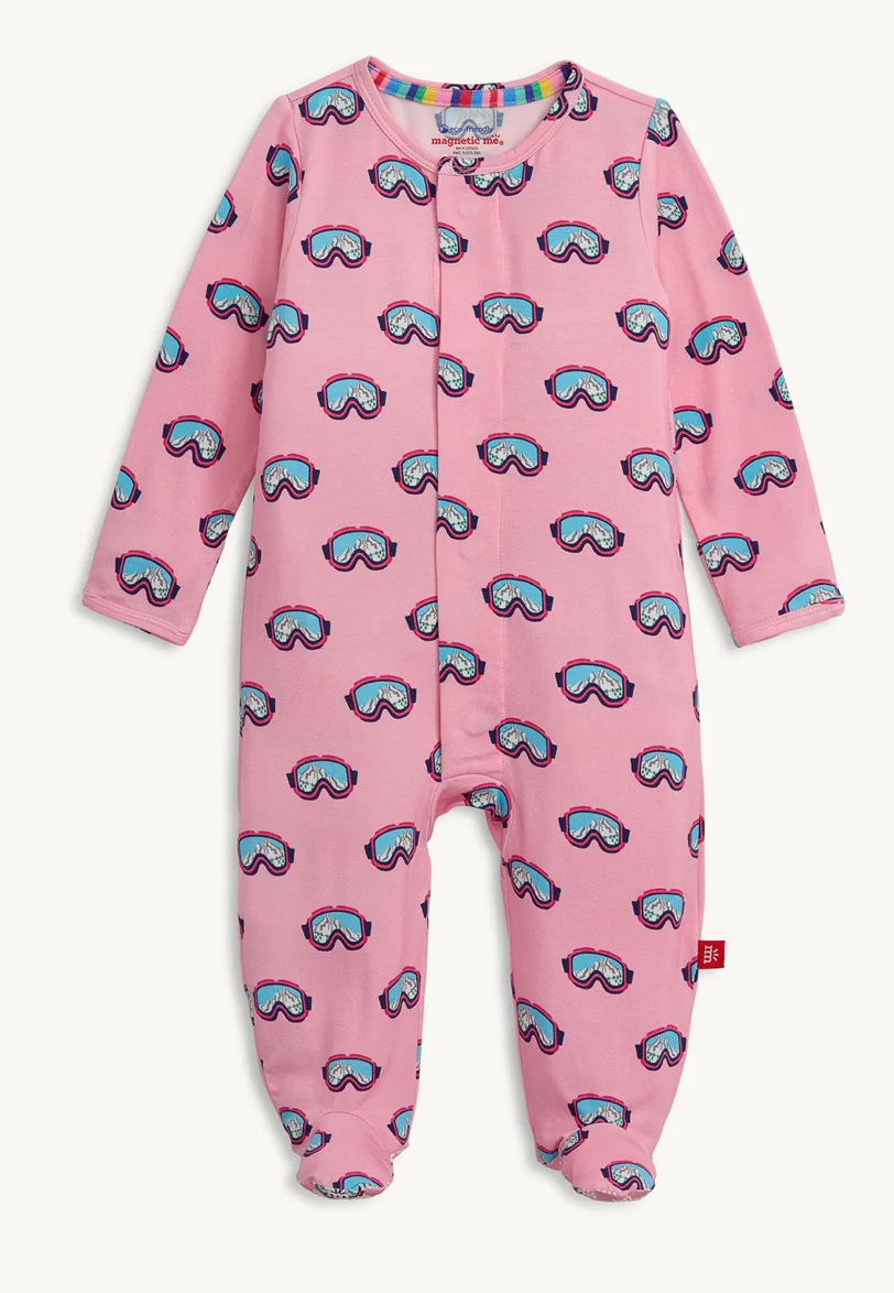 - Magnetic closures: magnets line the seam from the neck to upper thigh for sizes up to 0-3m & from neck to crotch for sizes 3-6m and up.