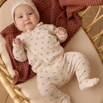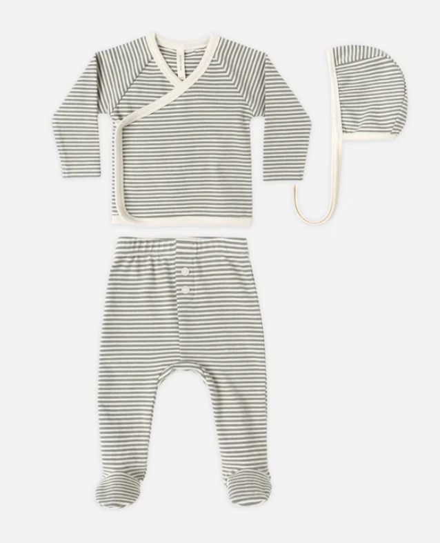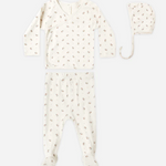The Take Home Set is the perfect look for your newborn. Featuring a sweet bonnet, wrap snap top with crochet lace ruffle detail, and footed drawstring pants.