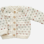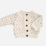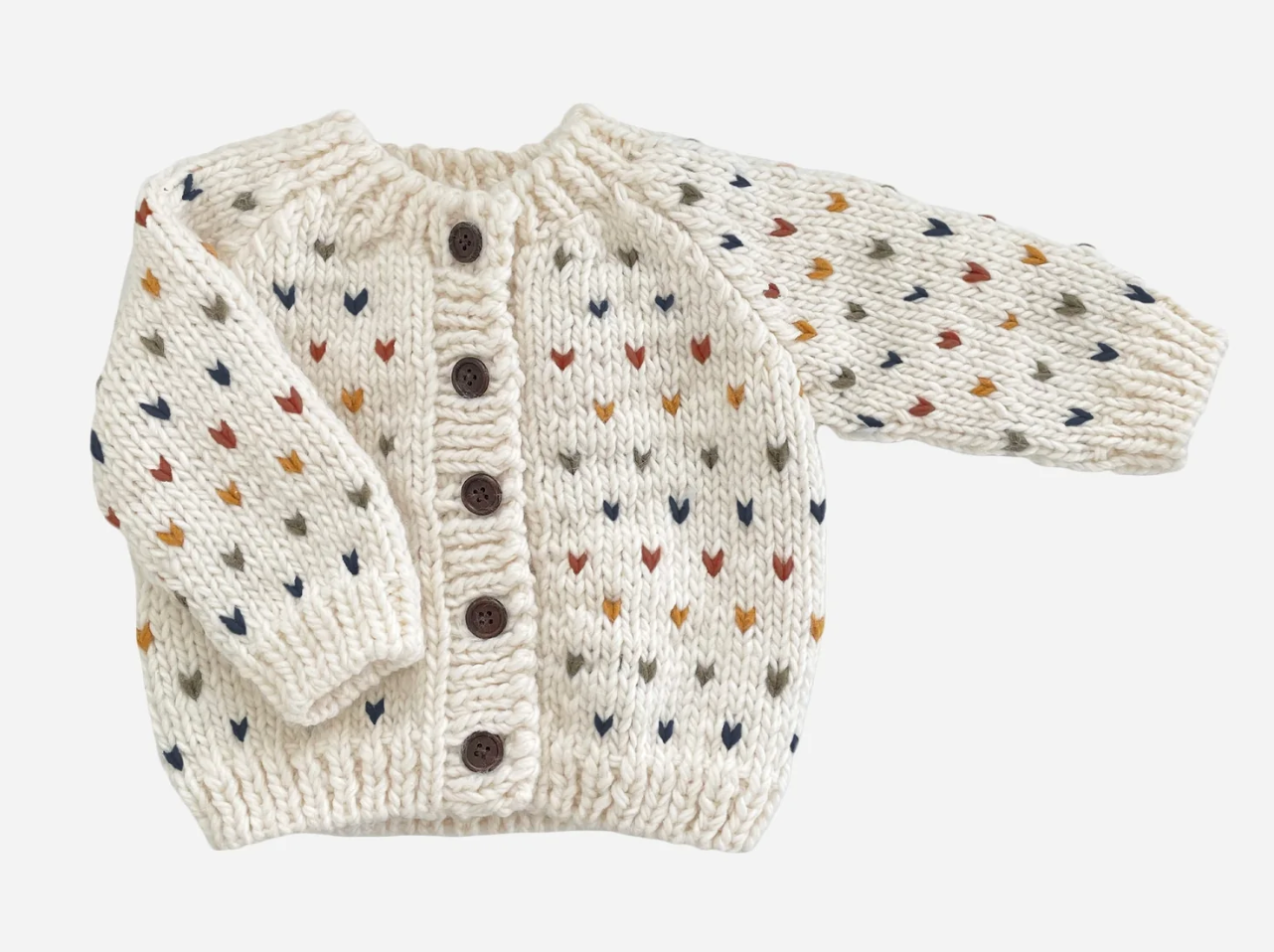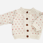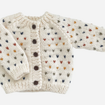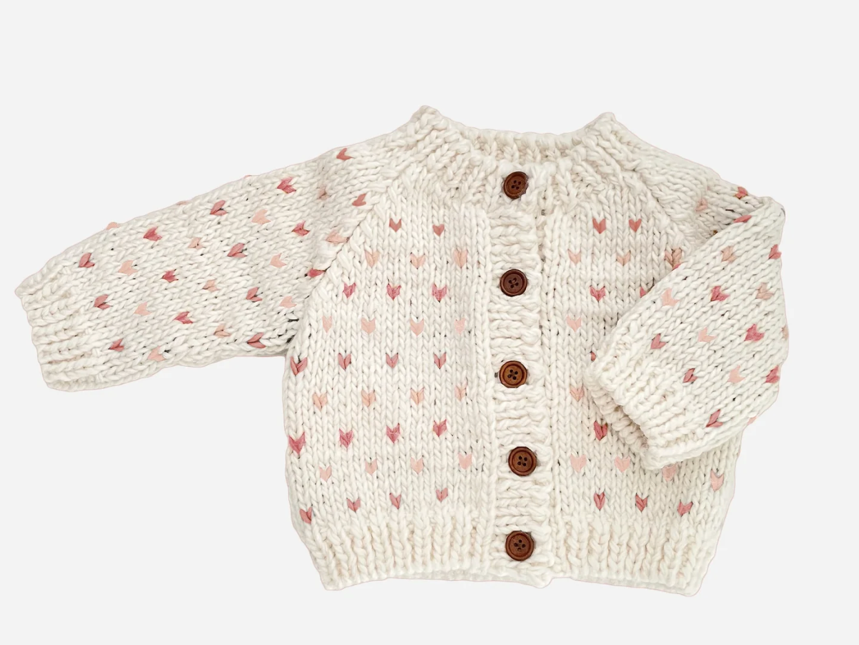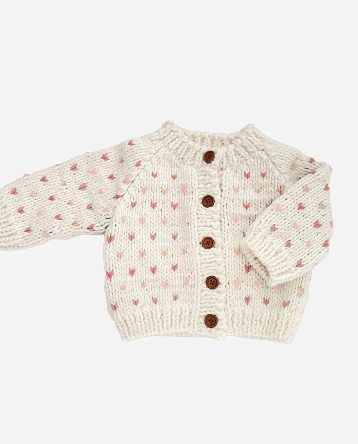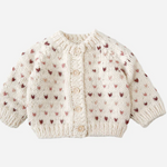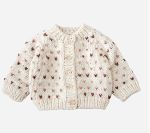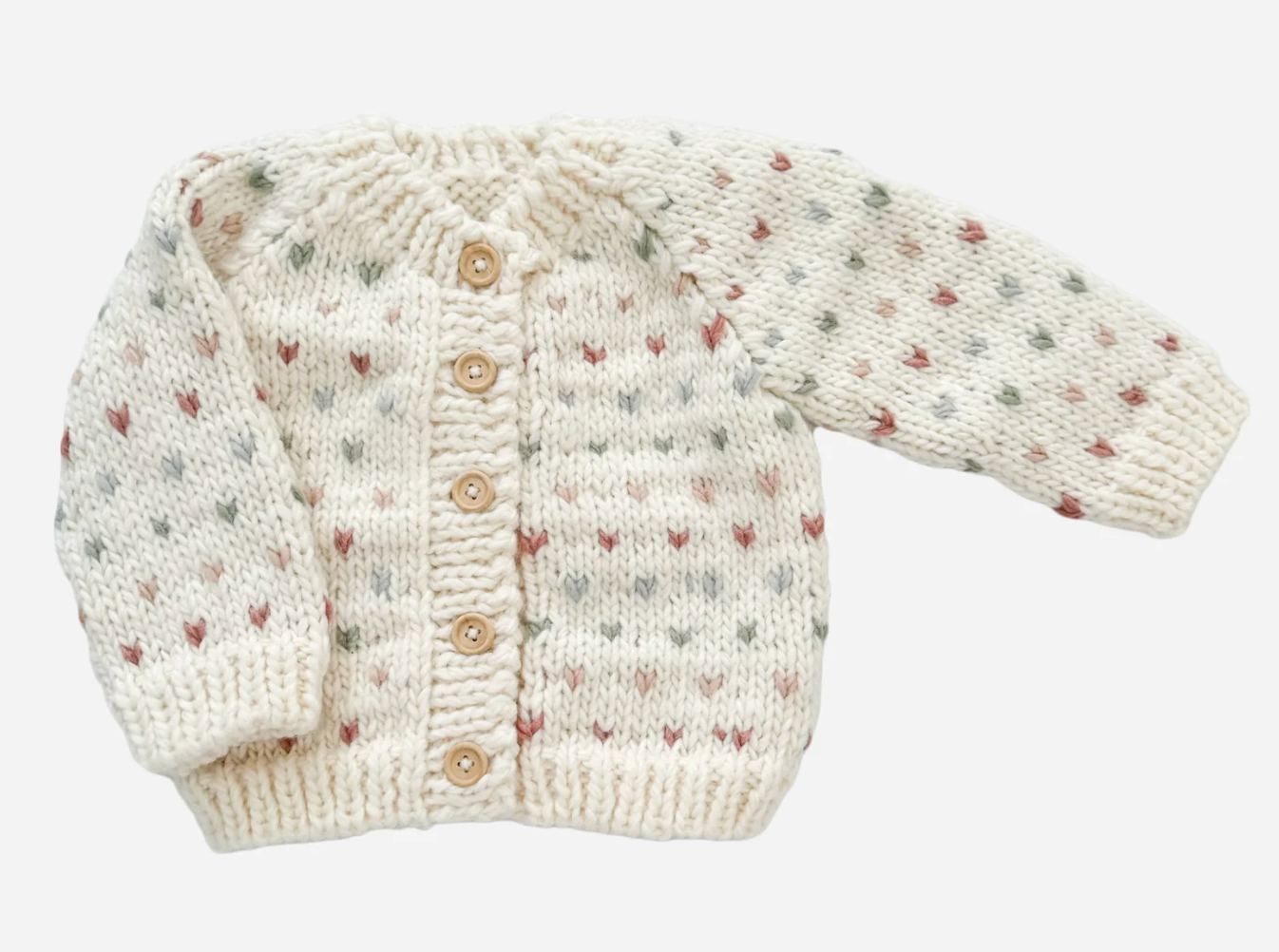 Featuring a gentle Cream base, this Cardigan's welcoming tiny hearts will have your little one feeling like they're wrapped in your love. Featuring hearts in our colors Blush, Rose, Bowie Grey, and Mist. Don't forget the matching hat and mittens.