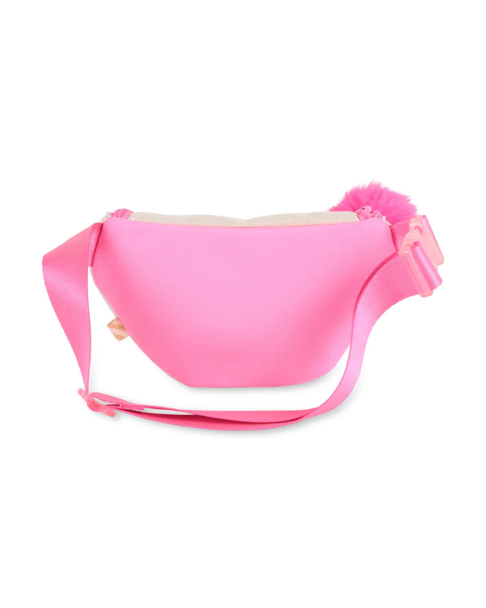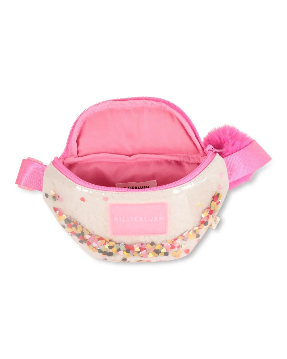 With its fluffy fleece covered in transparent polyvinyl chloride and its heart glitter inside, this BILLIEBLUSH fanny pack is a real glitter accessory. The fleece pompom and BILLIEBLUSH badge add a playful touch, while the adjustable strap with transparent plastic clip and the zipper ensure easy and stylish use.
