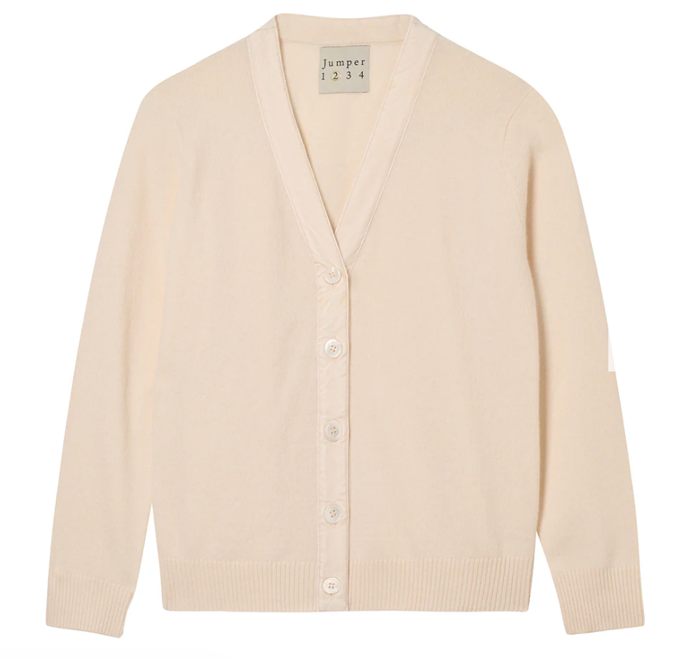 Jumper 1234 cashmere wool cardigan. Cream vee neck cardigan in our fabulous cashmere and wool blend with matching velvet trim. Available in 4 colours, this is going to be one of our go to cardigans this season, it's a neat fit so do size up if you want a more boyfriend feeling.