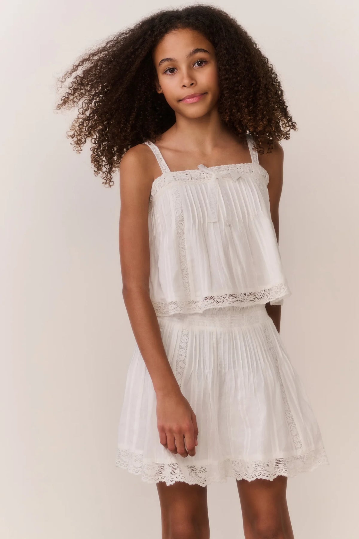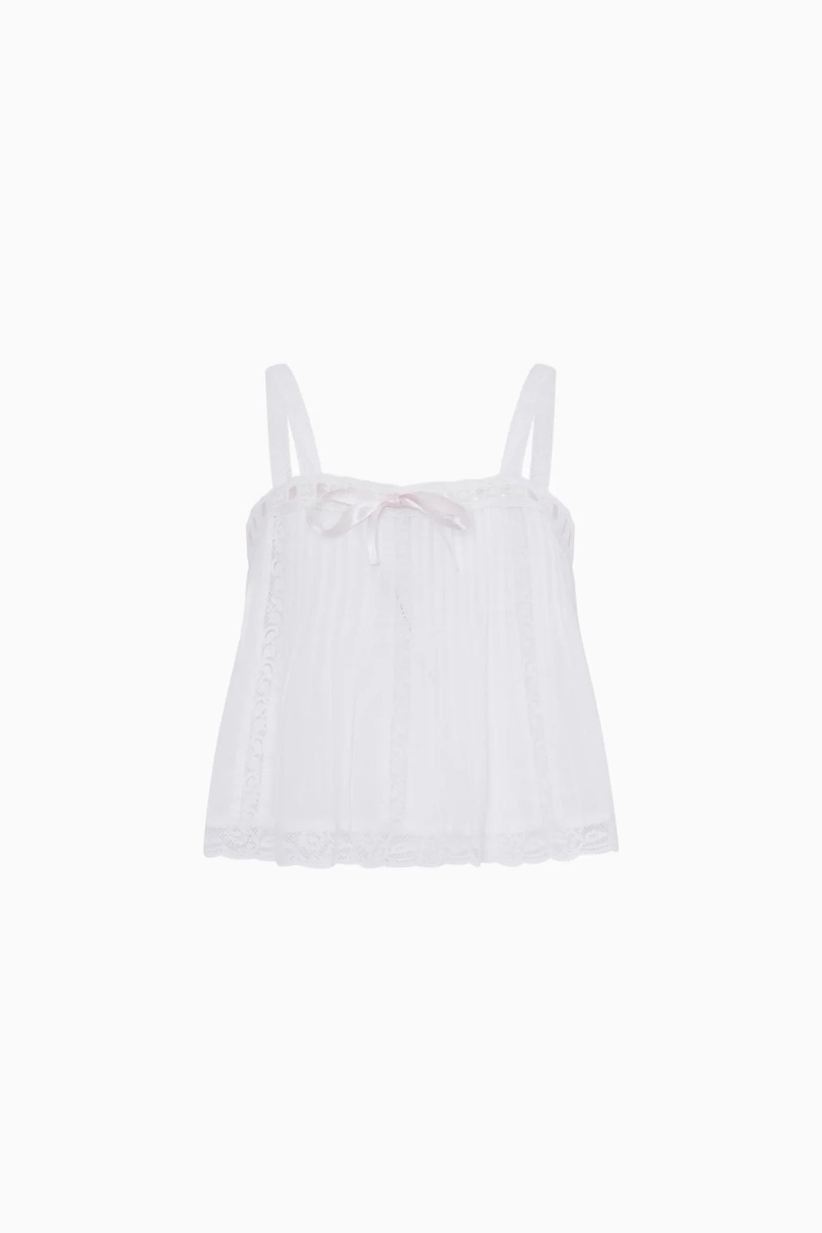 Sweet and airy, the Brynlynn Top features a square neckline and delicate open-work lace patterns. A center front ribbon bow adds a touch of whimsy to the loose, breezy fit, while scalloped lace hem provides a charming finish.