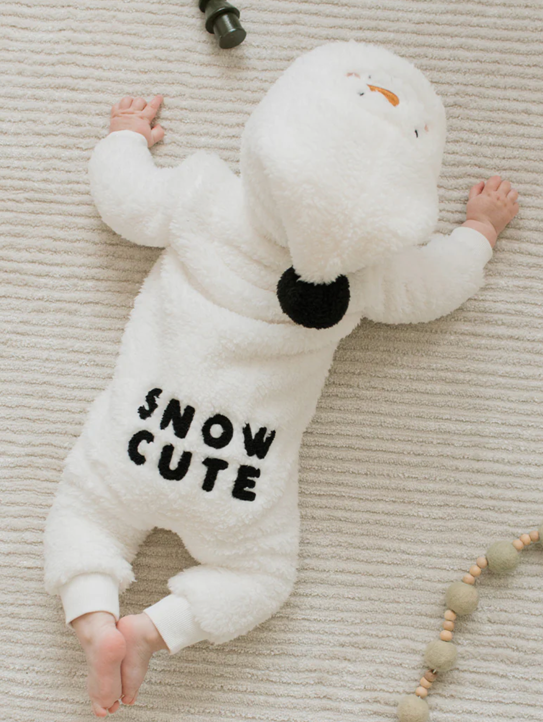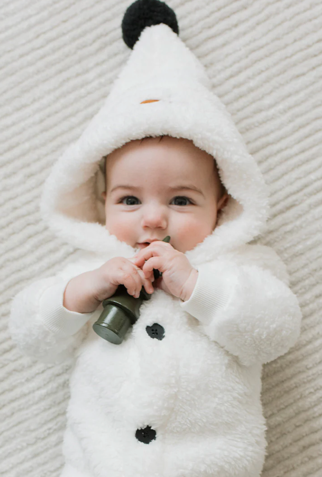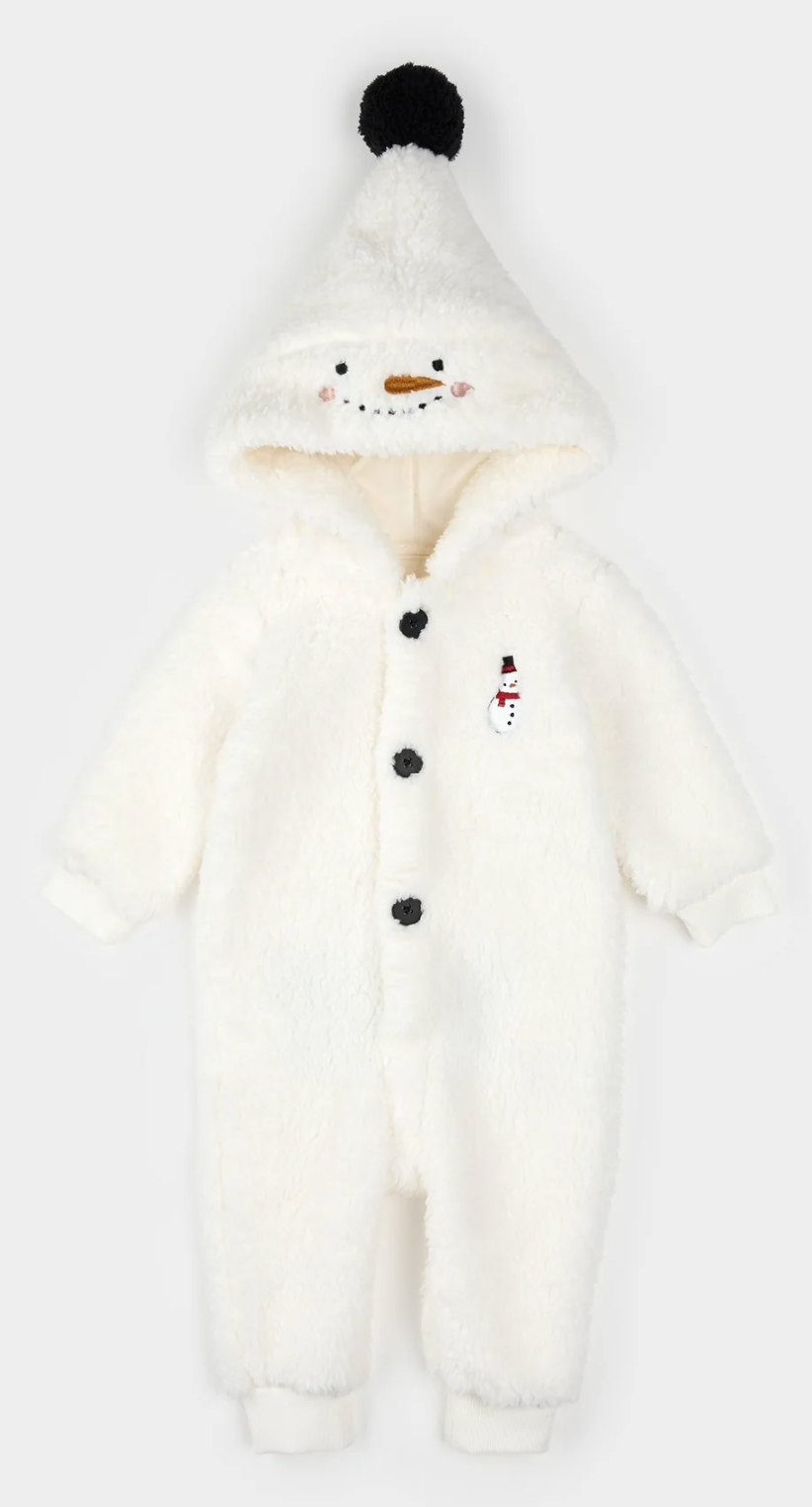 Wrap them in winter magic with this adorable snowman playsuit. Featuring a pointed hood with a black pompom and a cheeky snowman face, the playsuit is perfect for snow days with the family and – of course – a festive photoshoot. Made from the coziest sherpa and finished with ribbed cuffs and ankles, it’s totally snug choice for your winter baby.