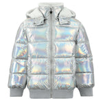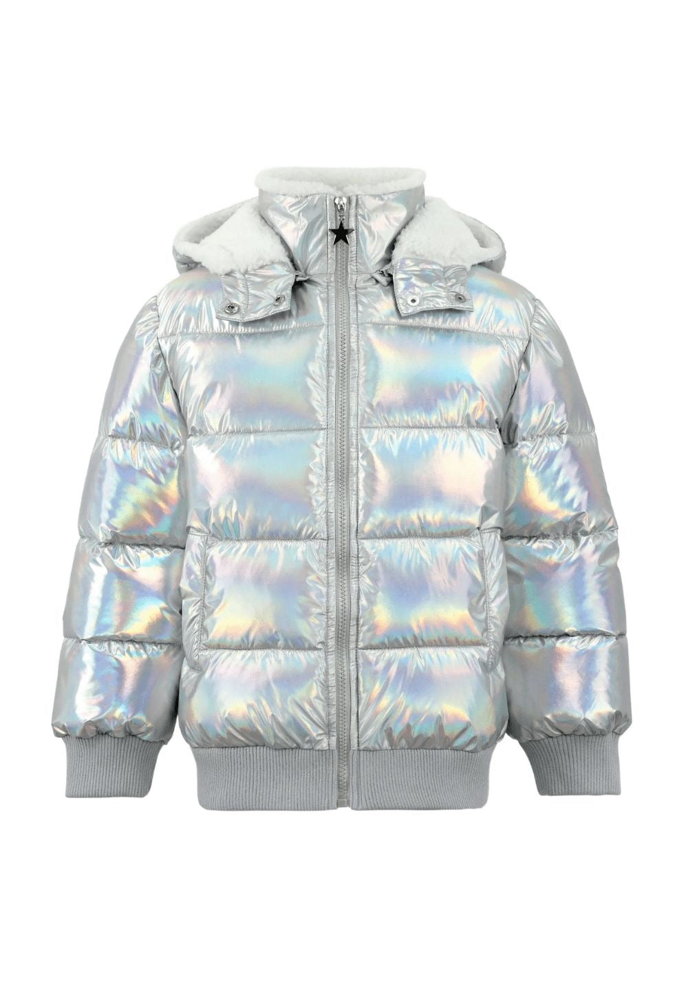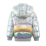 Coats that steal the spotlight—this holographic puffer features a shimmering rainbow-finish shell with a bold “rainbow back” design for full effect. It’s built to brave the cold with insulation, ribbed cuffs, and a cozy faux-shearling lined hood, making it as warm as it is standout. Crafted from a durable polyester shell with faux-shearling lining, this piece is perfect for making every chilly day a fashion moment.