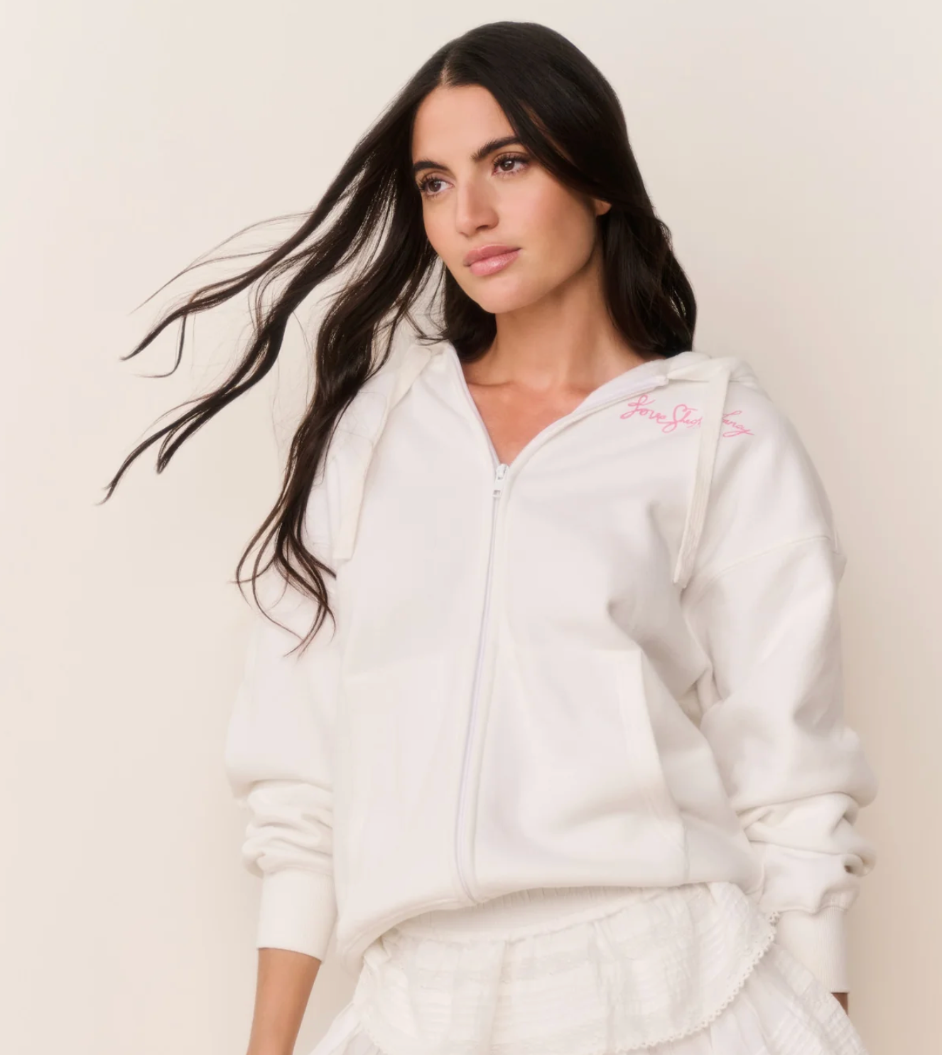 The Ballie Jacket is a cozy zip-up hoodie crafted from a soft cotton blend, perfect for relaxed winter styling. Featuring a two-tone mountainscape graphic on the back, LoveShackFancy logo on the chest, and kangaroo pockets, it combines comfort with signature playful detailing. Ribbed trims at the sleeves and hem and a self-doubled hood complete this easy-fit, casual piece.
