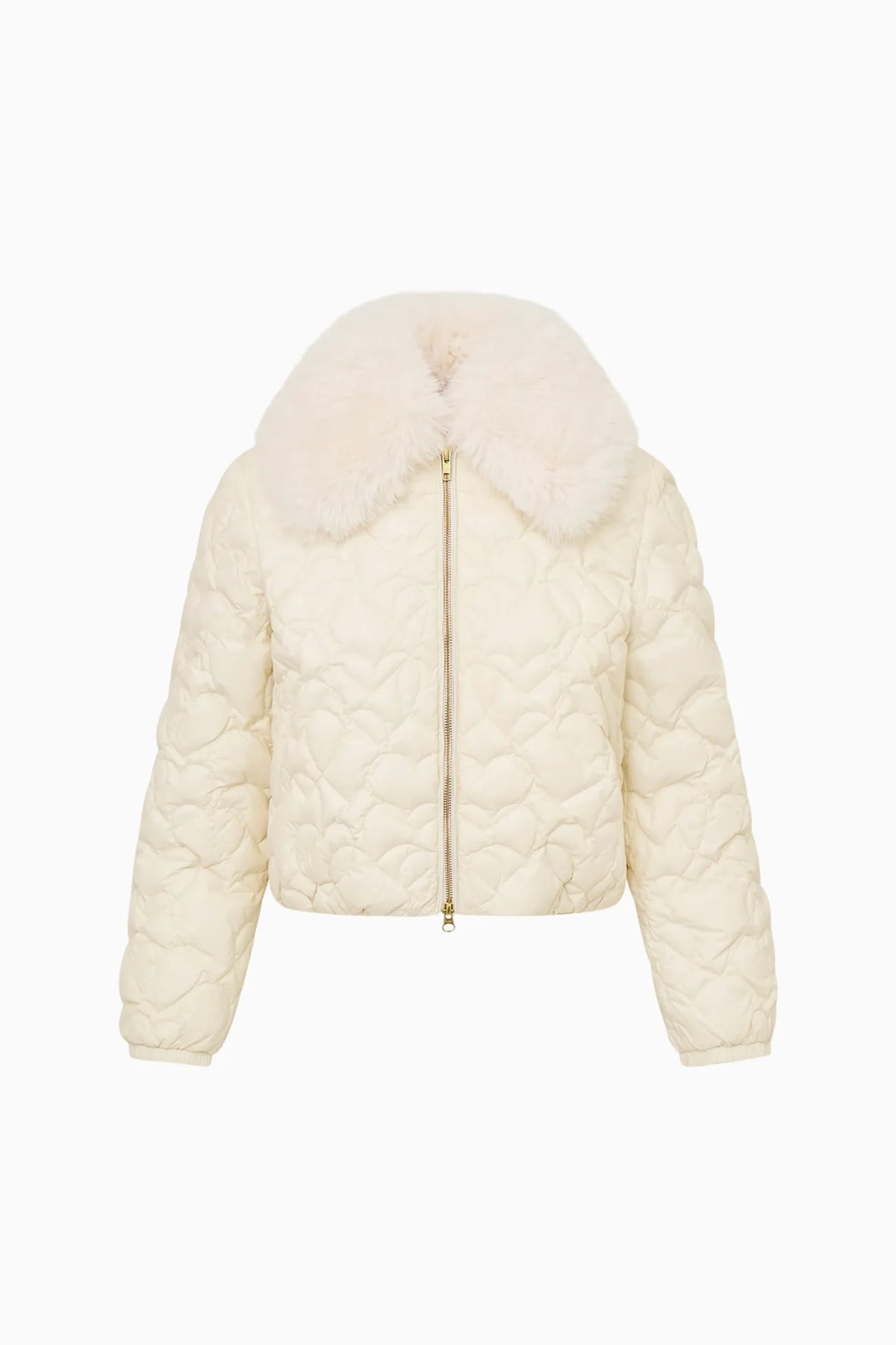 The Sandria Jacket is a cozy, stylish puffer crafted from ivory nylon with LoveShackFancy’s signature heart quilting. Designed with a detachable fur collar, long sleeves, side pockets, and a gold zipper closure, it offers warmth with a feminine, elevated touch.