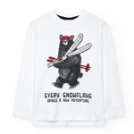 Cotton T-shirt for boys in white with a print of a bear on skis, accompanied by the phrase "Every Snowflake Brings A New Adventure". Ideal for the autumn and winter seasons, its soft jersey fabric ensures comfort throughout the day. The white colour allows for easy pairing with trousers or jackets of any shade.