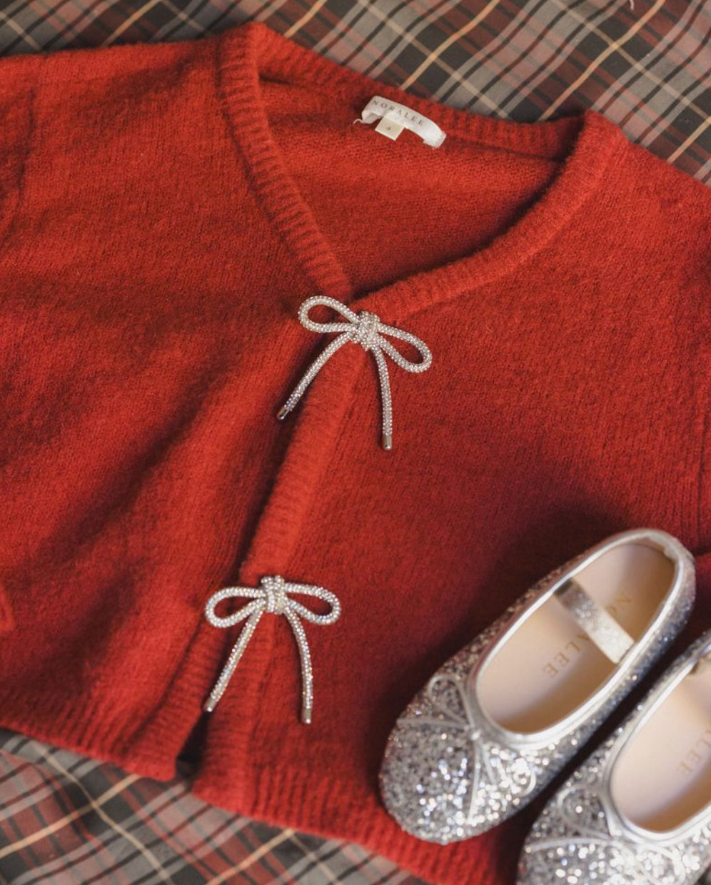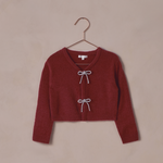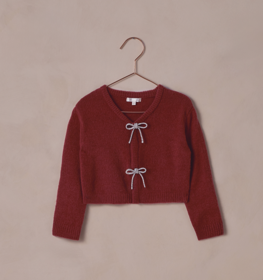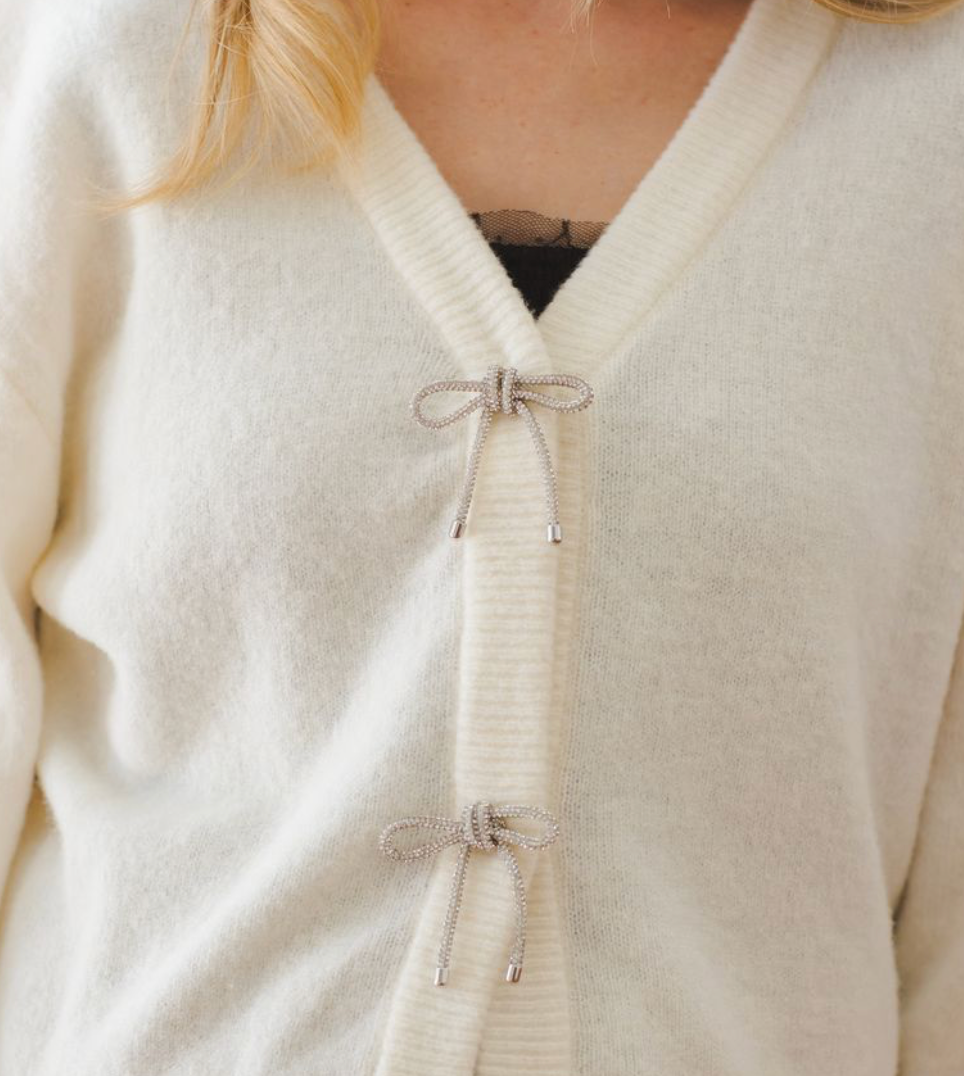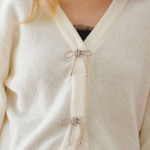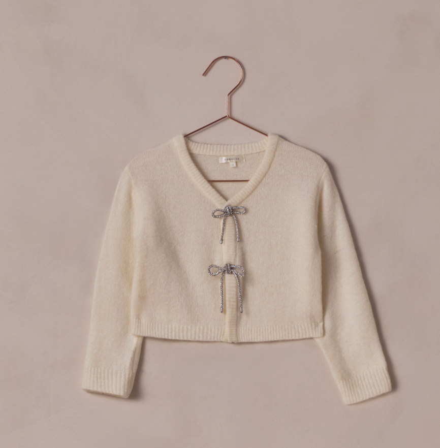 The Noralee Bow Cardigan is a cozy V-neck knit with relaxed raglan sleeves, two-button closure, and fixed bow accents—crafted in a ‘natural’ hue with a 60% cotton / 40% acrylic blend for softness and charm.