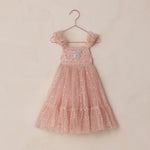 Our Clara Dress, crafted from shimmering tulle, features a smocked bodice adorned with a bow appliqué, gathered bubble cap sleeves, and a full, tiered skirt.