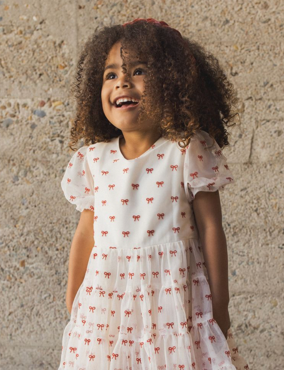 The Noralee Dottie Dress is a dreamy midi-length dress made of flocked tulle with a layered skirt, full puffed sleeves, and a delicate button-back closure. Perfect for twirling, it adds a fairytale touch to any occasion.