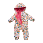 Fresh and Flowery! Keep your tiny bundle of joy warm and cozy in our super snuggly Baby Girls Snowsuit in Watercolor Floral. We've added a fun, flirty and feminine front ruffle to our water resistant Snowsuit. Smart details include a partial pink sherpa lining to protect baby from the chill, as well as fold-over hand and feet cuffs, a sturdy front zipper closure and a locker loop for easy hanging once inside and warmed up. Filled with premium duck down for warmth without weight.