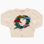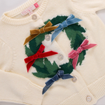 Hooray for the holidays! A lush beribboned evergreen wreath takes centerstage on Pink Chicken's charming winter white Girls Constance Sweater. Colorful velvet bows and a sparkly green thread throughout bring this classic cardigan to life. A soft gathered puff shoulder, ribbed waist and cuffs and a cream glitter button closure elevate this well-loved shape. Pink Chicken Constance Sweater - Available at Skipper & Scout!