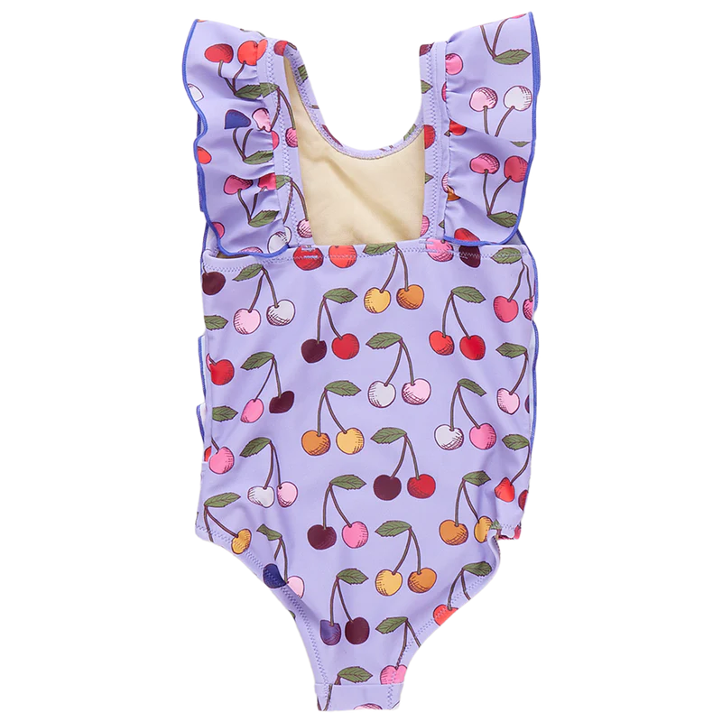 Cherry On Top! Our Girls Katniss Suit lights up with a colorful array of cheery cherry twins on a lavender ground. A pattern on pattern ruffle from shoulder to hip and a low dip in the back add a little extra flare to this fun and fashionable swimsuit. This flock favorite one-piece feels right at home at the beach, a lakeside retreat, or poolside at home or on vacation. Pair with our Girls and Baby Girls Joy Tankini for a sunny sibling moment.