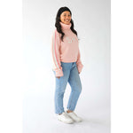 This Ellsworth & Ivey sweater features a turtleneck and long sleeves. It has a cropped length and ribbed trim at the waist and cuffs. It is made of 100% acrylic. The suggested care instruction is hand wash or machine wash cold and hang to dry. The sweater may shrink slightly if put in a dryer. This is a medium knit and pullover style.