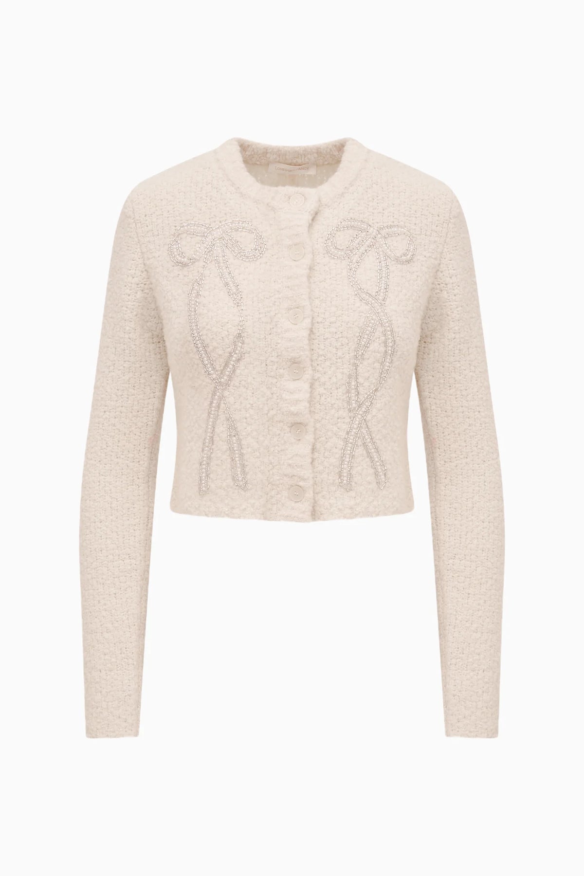 The Leocadia Cardigan is an updated version of last year’s beloved silhouette, crafted from soft, blended yarn for a cozy yet polished feel. Featuring hand-beaded bows down the front with pearl and silver glass beads, this cardigan is finished with delicate shell buttons for a feminine, elevated touch.