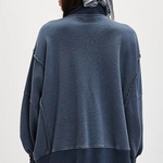 Features: Soft fabrication, collared neckline with snap-button closures, drop-shoulder sleeves, exposed seams, side-slit detail, ribbed hems