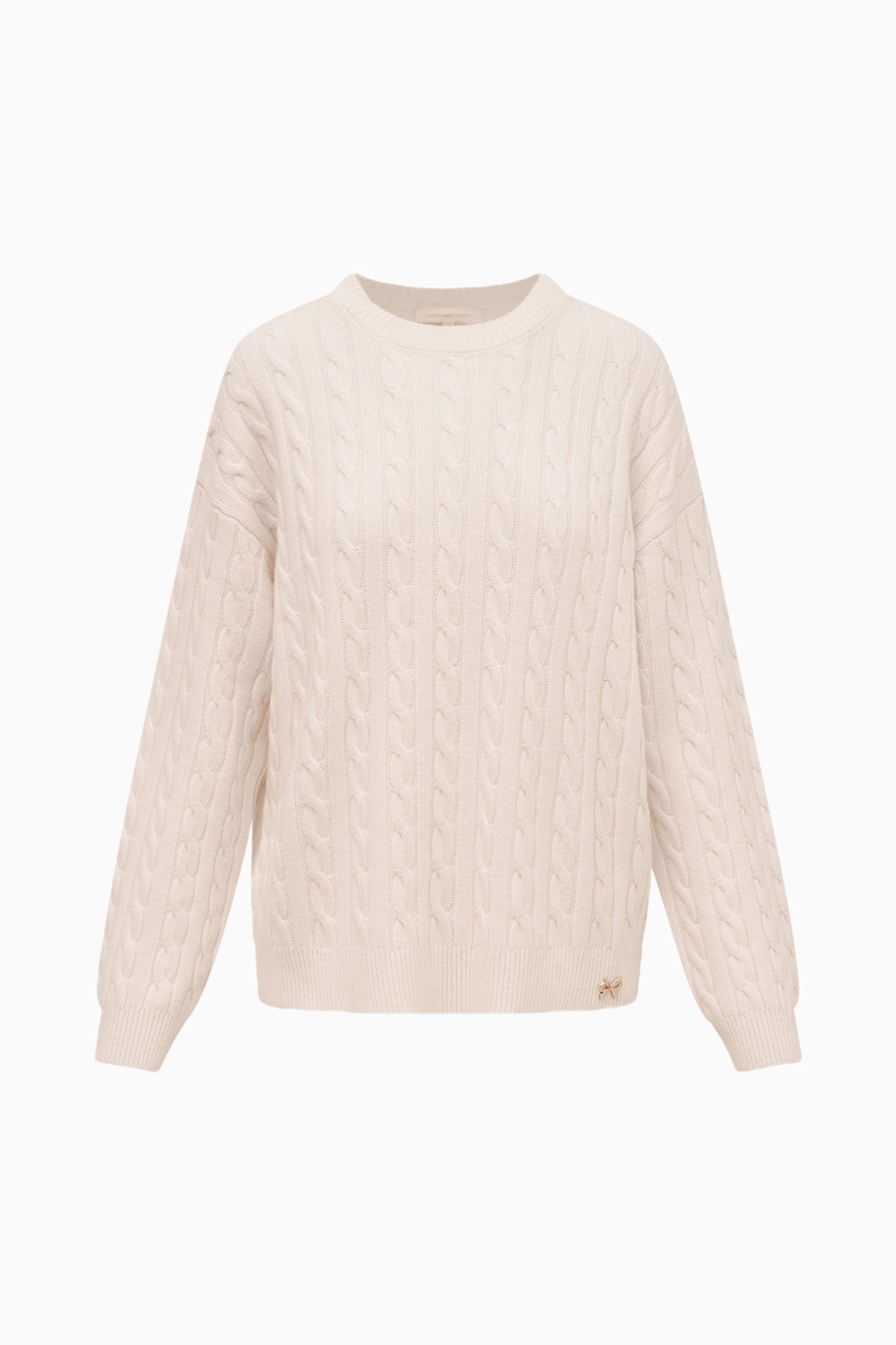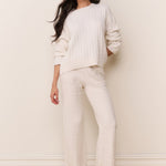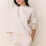 The Kym Sweater is a cozy, oversized pullover crafted from a soft blended yarn, perfect for lounging or casual winter styling. Featuring a ribbed cable stitch throughout, a classic crew neckline, and ribbed trims at the cuffs, hem, and neckline, it’s finished with a delicate gold bow charm at the hem for a feminine touch. Pairs perfectly with the matching Freya knit loungewear pants.