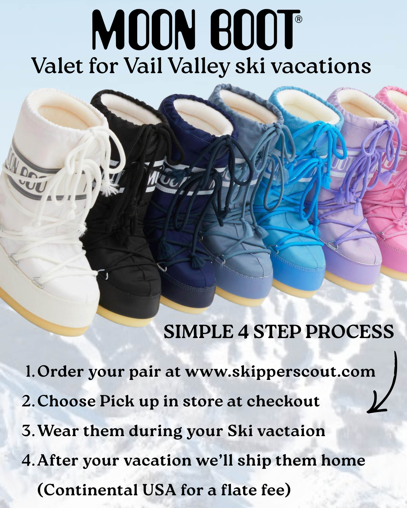 Don't waste precious luggage space packing bulky snow boots. With Skipper & Scout's Moon Boot Valet, you can order your favorite Moon Boots online and have them shipped directly to your hotel, condo, or private residence in Vail. We ensure your boots are waiting for you when you arrive, so you can hit the aprés-ski scene immediately.