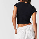 The most effortless way to take your tee collection to the next level, this vintage-inspired version is featured in a cropped silhouette with exaggerated seaming, slightly capped sleeves, and tapered bottom detail for added shape.